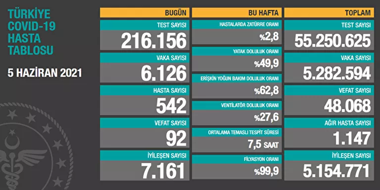 Sağlık Bakanlığı’nın açıkladığı verilere göre, Türkiye’de son 24 saatte 216 bin 156 Kovid-19 testi yapıldı, 6 bin 126 kişinin testi pozitif çıktı, günlük vefat sayısı 92 kişi olarak kayıtlara geçti, hasta sayısı 542 oldu.