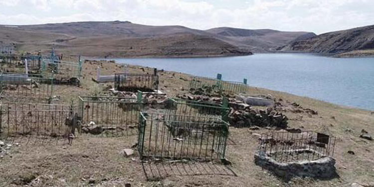 Su seviyesinin düştüğü Palandöken Baraj Gölü'nde, onlarca mezar ve kemik ortaya çıktı.