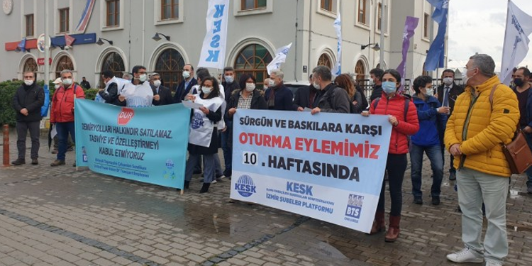 Birleşik Taşımacılık Sendikası (BTS) İzmir Şubesi ve KESK İzmir Şubeler Platformu’nun sürgünlere ve baskılara karşı başlattığı oturma eyleminin 10’uncu haftasında kamu emekçilerinin ek zam talebi dile getirildi. Alsancak Gar önünde yapılan açıklamaya HDP İzmir Milletvekili Murat Çepni ve CHP İzmir Milletvekili Atilla Sertel de destek verdi.