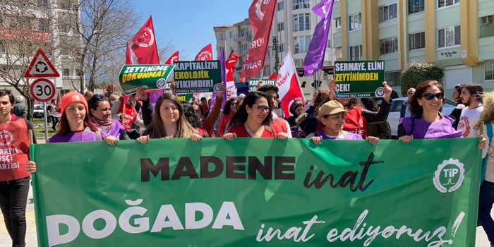 Kent merkezinde bulunan Mehmet Ali Eren Parkı’nda bir araya gelerek miting alanına doğru yapılan yürüyüşte “Madene inat doğada inat ediyoruz” pankartı açıldı. “Zeytinime dokunma” ve “Kapitalizm ekolojik yıkımdır” dövizlerinin taşındığı yürüyüşte sık sık “Maden gidecek zeytin kalacak” sloganı atıldı.