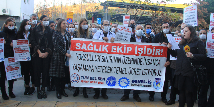 Tüm Belediye ve Yerel Yönetim Hizmetleri Emekçileri Sendikası (TÜM BEL-SEN) İzmir Şubeleri, sağlık ve sosyal hizmet emekçilerinin maaşlarının yoksulluk sınırı üzerine çıkarılması ve ek göstergenin uygulanması talepleriyle Eşrefpaşa Hastanesi önünde basın açıklaması gerçekleştirdi. Açıklamada, “Yoksulluk sınırının üzerinde insanca yaşamaya yetecek temel ücret istiyoruz” ve “İnsanca yaşamak insanca çalışmak için” yazılı pankart ve dövizler açılırken, grup kitle sık sık, “Susma sustukça sıra sana gelecek” sloganı attı.