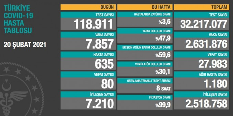 Türkiye’de Sağlık Bakanlığı’nın açıkladığı verilere göre; koronavirüs (Kovid-19) nedeniyle 80 kişi daha hayatını kaybetti, 635 yeni hasta dahil olmak üzere 7 bin 857 yeni vaka tespit edildi.