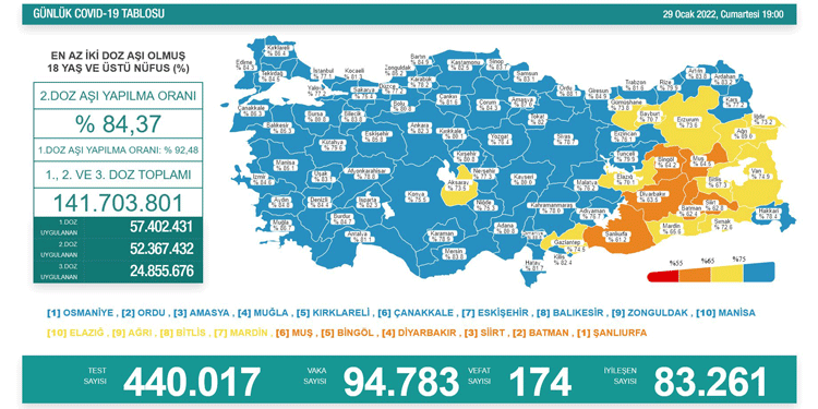 Sağlık Bakalığı tarafından yayınlanan verilere göre: Türkiye’de son 24 saatte 440 bin 17 Kovid-19 testi yapıldı, 94 bin 783 kişinin testi pozitif çıktı, 174 kişi yaşamını yitirdi.
