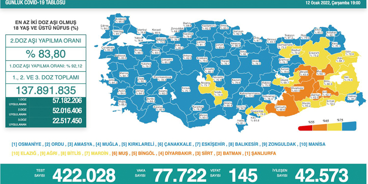 Buna göre, son 24 saatte 422 bin 28 Kovid-19 testi yapıldı, 77 bin 722 kişinin testi pozitif çıktı, 145 kişi yaşamını yitirdi.