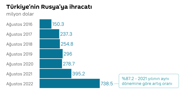 Türkiye’nin Ağustos ayında en fazla ihracat yaptığı 6. ülke Rusya oldu. Türkiye’nin Rusya’ya dış satımı, Ağustos ayı döneminde geçen yılın aynı dönemine göre yüzde 87.2 artarak 738 milyon 527 bin dolarla tüm zamanların en yüksek aylık rakamına ulaştı.