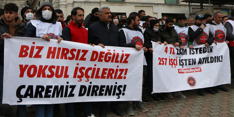 Ücretlerine yapılan yüzde 8’lik zammı kabul etmeyerek eylem yapan ve işlerine son verilen Depo, Liman, Tersane ve Deniz İşçileri Sendikası (DGD-SEN) üyesi Migros Esenyurt depo işçilerinin eylemi 12’inci gününde devam etti. 12 gündür depo önünde eylemini sürdüren işçiler, işveren Tuncay Özilhan’ı, Beyoğlu’nda bulunan Türk Sanayicileri ve İş İnsanları Derneği (TÜSİAD) önünde bir araya gelerek protesto etti. “Hırsız değiliz, yoksul işçileriz”, “4 TL zam istedi, 257 işçi işten atıldı”, “İşçiler açken Özilhan’a huzur yok” yazılı pankartların açıldığı açıklamada sık sık, “İşçiler açken Özilhan’a huzur yok” ve “Direnen işçiler yenilmezler” sloganları atıldı. Açıklamaya birçok siyasi parti temsilcisinin yanı sıra Halkların Demokratik Partisi (HDP) İstanbul milletvekili Musa Piroğlu’da destek verdi.
