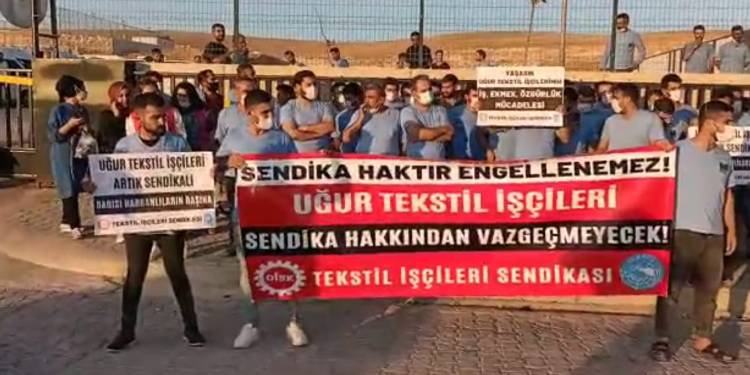 Devrimci İşçi Sendikaları Konfederasyonu’na (DİSK) bağlı Tekstil İşçileri Sendikası, Uğur Tekstil adlı işyerinin sendikal haklarını 10 gündür tanımamasını yaptığı açıklama ile protesto etti. Urfa 2’nci Organize Sanayi Bölgesi’nde bulunan Uğur Tekstil Fabrikası önünde yapılan açıklamada “ Sendika haktır engellenemez Uğur Tekstil işçileri sendika haklarından vazgeçmeyecek” pankartı açıldı. Açıklamaya çok sayıda işçi katıldı.