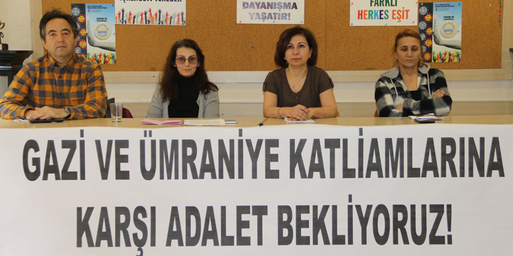 12-15 Mart 1995’te yaşanan Gazi-Ümraniye Katliamının yıl dönümü dolayısıyla devam eden katliam davasına ilişkin davanın avukatları ile aileler, İnsan Hakları Derneği (İHD) İstanbul Şubesi’nde basın toplantısı düzenledi. Toplantıya, avukat Sevim Akat, Gazi Katliamı’nda katledilen Zeynep Poyraz’ın ablası Kibar Poyraz, katledilen Ali Yıldırım’ın ağabeyi Yaşar Yıldırım ve İHD Şube Başkanı Gülseren Yoleri katıldı. Toplantıda salonuna, “Gazi ve Ümraniye Katliamlarına karşı adalet bekliyoruz” yazılı pankart asıldı.