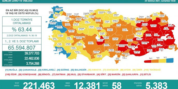 Sağlık Bakanlığı’nın günlük açıkladığı koronavirüs verilere göre; son 24 saatte 221.463 test yapıldı ve 12.381 yeni vaka tespit edildi. 58 kişinin koronavirüs sebebiyle hayatını kaybettiği belirtildi.