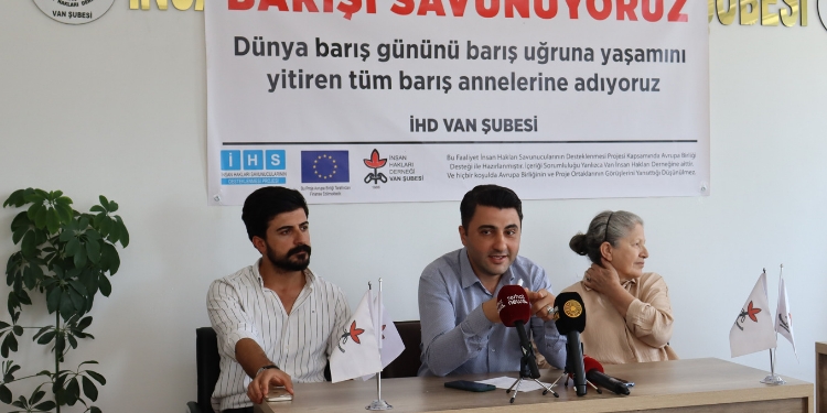 İnsan Hakları Derneği (İHD) Wan Şubesi, 1 Eylül Dünya Barış Günü nedeniyle yarın yapılacak olan basın açıklaması için çağrı yaptı. Derneğin açıklama yaptığı salona; “Barışı savunuyoruz. Dünya barış gününü barış uğruna yaşamını yitiren tüm annelere adıyoruz” yazılı pankart asıldı. İHD Wan Şube Başkanı Fırat Durmaz, barışı istemenin bir insan hakkı olduğunu belirterek, “İHD’nin de paylaştığı temel yaklaşım bunun üzerinedir. İnsan haklarının özgürlüklere dayalı barışın özgürlüklere dayalı olduğu temelindedir. Yani bugün bir toplumda, bir ulusta, bir ülkede kişiler ve toplum özgürleştikçe barışın temelleri atılmış olur. Barış; kişinin, kişi özgürlüğüyle, sağlık, konut özgürlüğüyle, kültürel haklarıyla, dil özgürlüğüyle bir toplumu özgürleştirdiğinizde bir barışın temelini atmış olursunuz” dedi.