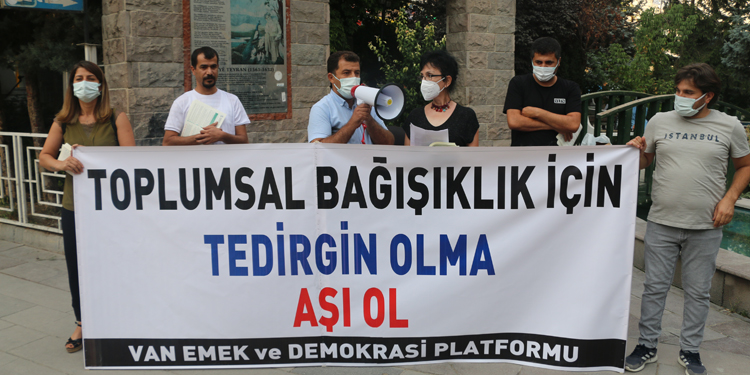 Van Emek ve Demokrasi Platformu, Cumhuriyet Caddesi’nde bulunan Feqiyê Feyran Parkı’nda “Tedirgin Olma Aşı Ol” kampanyası kapsamında broşür dağıtarak açıklama yaptı. Açıklamayı Van Tabip Odası Yönetim Kurulu Üyesi Dr. Ayfer Bostan yaptı.