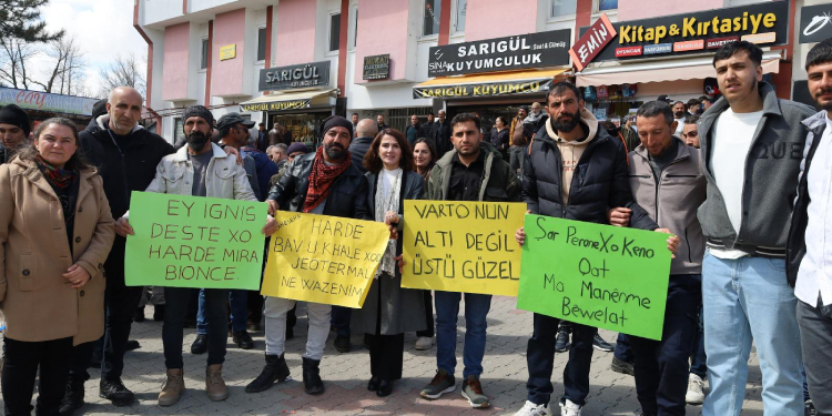 İnsanın doğanın bir parçası olduğunun altını çizen DEM Parti Mûş İl Eşbaşkanı İlyas Aslan, Meclis’ten geçen iklim yasasıyla birlikte bir çok kentte maden alarına ruhsat verildiğini anımsattı. Gîyadin’deki altın arama çalışmalarının ve Gimgim’daki JES projesinin bölgeye zararının olacağını kaydeden Aslan, “Bugün yapmamız gereken bu jeotermale karşı durmak. Biz de DEM Parti ve demokratik kurumlar olarak bütün gücümüzle 24 Nisan’da Varto’da yapılacak mitinge güçlü bir katılımla doğayı talana karşı duracağız” diye konuştu.