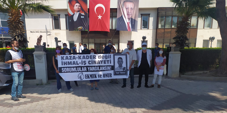 Ekmek ve Onur İşçi Derneği, 7 Eylül’de çöp toplama aracının altında kalarak yaşamını yitiren temizlik işçisi Yusuf Tümenci için Menemen Belediyesi önünde açıklama yaptı. “Kaza-kader değil, ihmal iş-cinayeti sorumlular yargılansın” pankartının açıldığı açıklamada konuşan Ekmek ve Onur İşçi Derneği üyesi İpek Karanfil, her gün 5 işçinin yaşamını yitirdiğini ve tüm iş cinayetlerinin önlenebilir kazalardan dolayı yaşandığına dikkati çekti. Karanfil, Türkiye’de cezasızlık politikasının iş cinayetlerine davetiye çıkardığını belirterek, ülkenin iş cinayetlerinde rekora koştuğunu aktardı. Artık işçilerin yaşamlarını yitirmesine tahammüllerinin kalmadığını söyleyen Karanfil, “İşçinin canının önemi olmadığı, patronların karına kar katma sürecinde hayatını kaybeden işçilerin ‘zayiat’ olarak görüldüğü yerde, yaşanan iş cinayetlerinin üzeri ‘kaza’ söylemiyle örtülmek isteniyor” dedi.