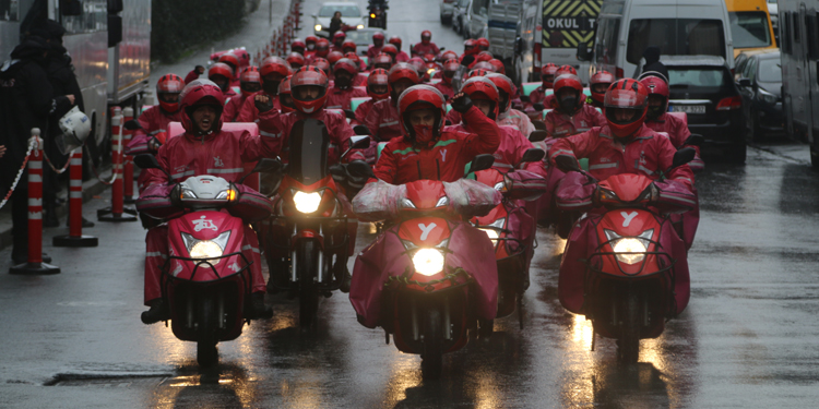 Devrimci İşçi Sendikası Konfederasyonu’na (DİSK) bağlı Nakliyat-İş Sendikası üyesi Yemeksepeti işçileri, yüzde 11’lik zam teklifine karşı eylemlerini sürdürüyor. Kuryeler, Şişli Levent’te bulunan Yemeksepeti Genel Müdürlüğü önünde 5 gündür grevde. Zamanla yarışan kuryeler, yaz kış demeden motorlarıyla zorlu hava koşullarına rağmen çalıyor. İşçiler, eyleminin 5’inci gününde direnişlerini ve taleplerini anlattı.