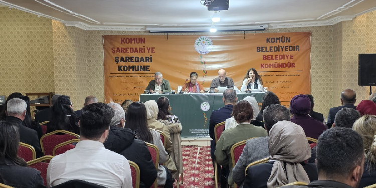 Halkların Eşitlik ve Demokrasi Partisi (DEM Parti) Demokratik Yerel Yönetimler Konferansı, Mêrdîn’in Artûklû (Artuklu) ilçesinde bulunan bir salonda ikinci gününde sürüyor. “Komün Belediyedir, Belediye Komündür” şiarıyla düzenlenen konferansa Mêrdîn ve ilçelerde seçilmiş eşbaşkan ve belediye meclis üyeleri katıldı. Konferans salonuna, “Em bi vîna jinê komunan; bi rêveberiyên xwecihî civaka azad ava dikin-Kadın iradesiyle komünleşiyor, yerel yönetimlerle özgür toplumu örüyoruz”, “Komün belediyedir, belediye komündür” yazılı pankartlar asıldı.