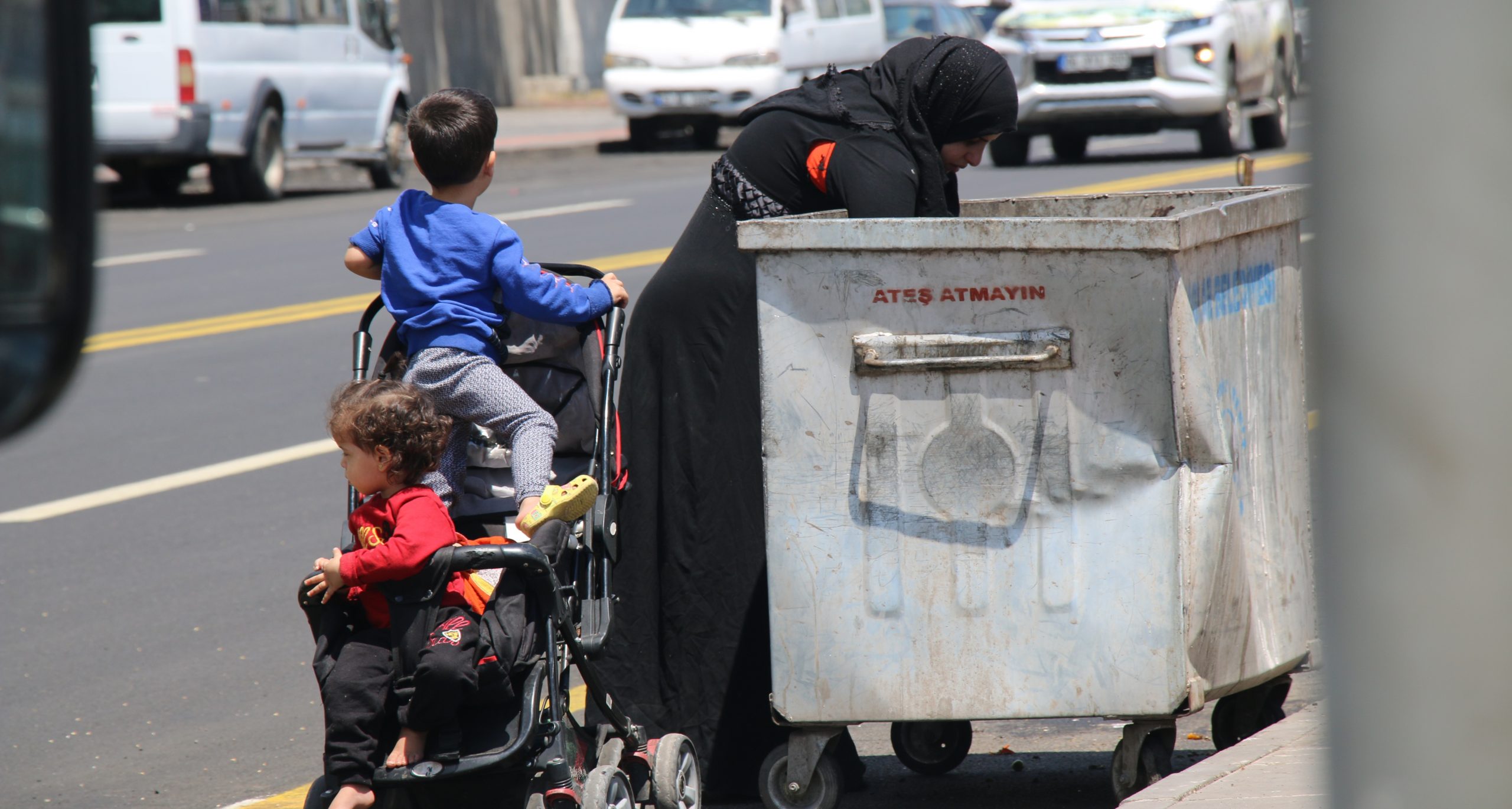 Koronavirüs (Kovid-19) nedeniyle Türkiye genelinde uygulanan tedbirler 8’inci gününde sürerken, Diyarbakır’da geçimini sağlamakta zorluk çeken yurttaşlar, sokaklarda arayış içinde. Bağlar ilçesinde 2’si çocuk arabası içinde, 2’si de yanında olan 4 çocuğuna bakan bir kadın, çöp konteynırında çocukları için yiyecek topladığı anlar kadraja yakalandı. Küçük çocuğun girdiği çöp konteynırında, bulduğu domatesleri annesine uzattığı, kadının ise ayıkladığı domatesleri yere bıraktığı poşetin içine bıraktığı görüldü.