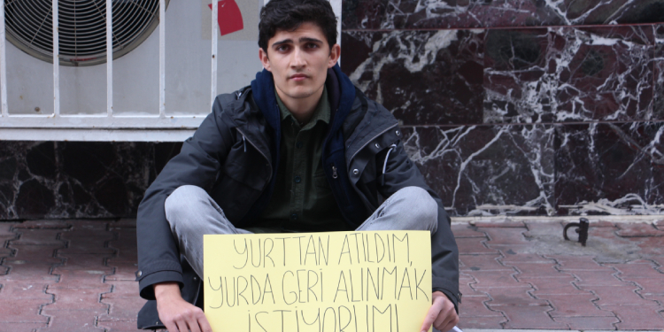 Bir aylık yurt parasını ödeyemediği için yurttan atılan Burak Başer, “Benimle aynı şeyi yaşayan, geçinemeyen tüm öğrenci arkadaşlarım için direneceğim ve kazanacağım” diyerek yurt önünde oturma eylemi başlattı.