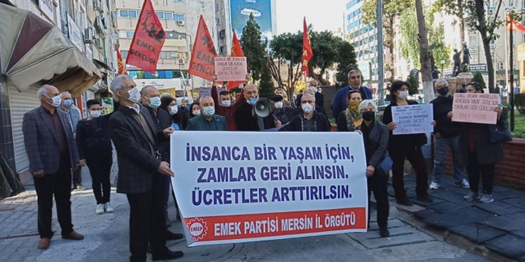 Emek Partisi (EMEP) Mersin İl Örgütü, temel tüketim maddelerine yapılan zamlara ilişkin binalarının önünde basın açıklaması yaptı. DİSK Genel-İş Mersin Şube Başkanı Kemal Göksoy ve İHD Mersin Şube Başkanı Hakkı Demir’in yanı sıra parti temsilcileri katıldı. “İnsanca bir yaşam için zamlar geri alınsın, ücretler artırılsın” pankartının açıldığı açıklamada, “İnsanca yaşamak istiyoruz” ve “AKP vergileri patronlardan topla” sloganları atıldı.